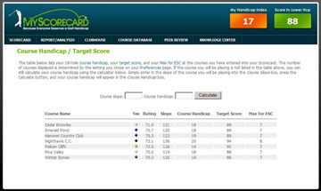at every course you have played, along with your target score and score limit for equitable stroke control. It also provides an easy tool to automatically calculate your Course Handicap at any course you would like to play.